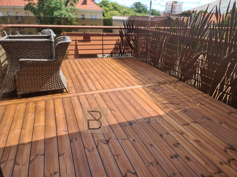 Medinė terasų danga reikalauja daug priežiūros. Esant stiprioms oro sąlygoms, tokioms kaip atšiaurus lietus ir tiesioginiai saulės spinduliai, medinės lentos gali lengvai išblukti, o dažų spalvos laikui bėgant gali išnykti.
